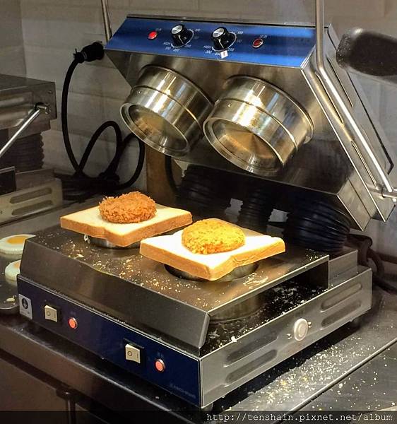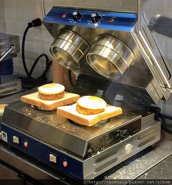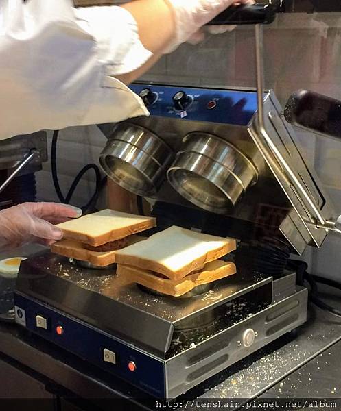 從照片,大家應該可以看出,三明治裡面的蛋,蛋白是熟的,但是蛋黃的部分是半熟的。外層的土司,吃起來沒有特別的地方,就是一般麵包店的土司。而且因為土司被機器熱壓的非常紮實,所以吃起來有點硬硬的感覺,尤其是上下兩片合起來的部分。