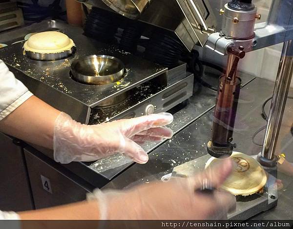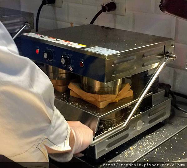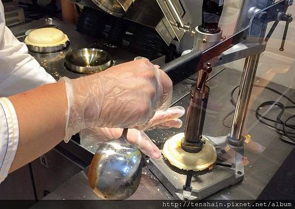 接下來,把熱壓好的三明治取下來,放到蓋印機器上。