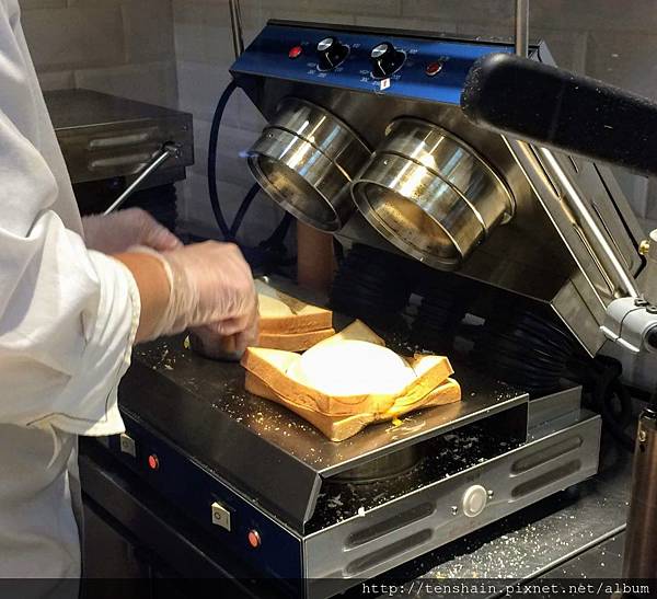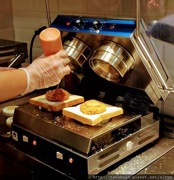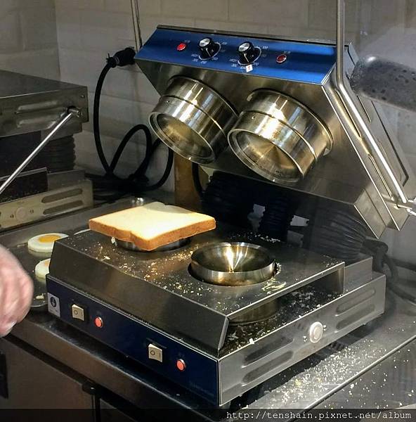 把機器上層用力往下壓著一段時間,這樣機器上下層經過加熱的碗狀金屬邊緣,充可以把上下兩片土司壓合起來,並把土司切割成圓形。
