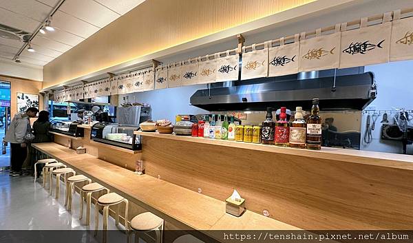 走進店內,長長的吧台座位區映入眼簾,用餐台面一塵不染,展現出店家對衛生與細節的用心。吧台後方是開放式料理台與燒烤爐,同樣維持得乾淨整潔,完全聞不到魚腥味或油煙味,用餐環境令人安心。
