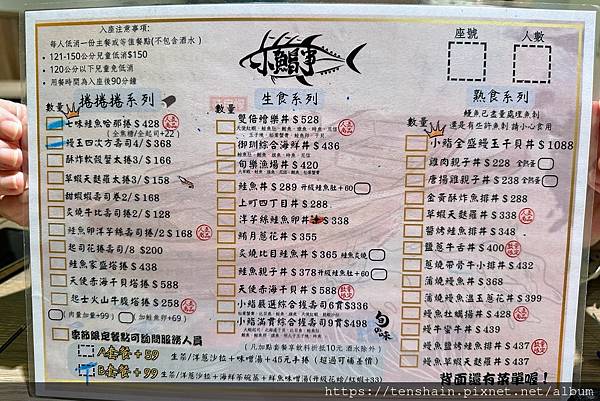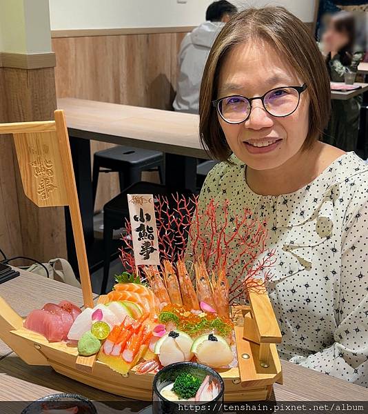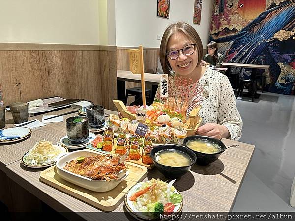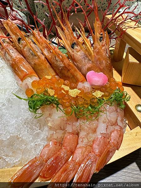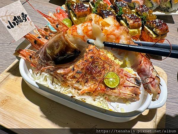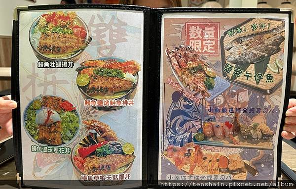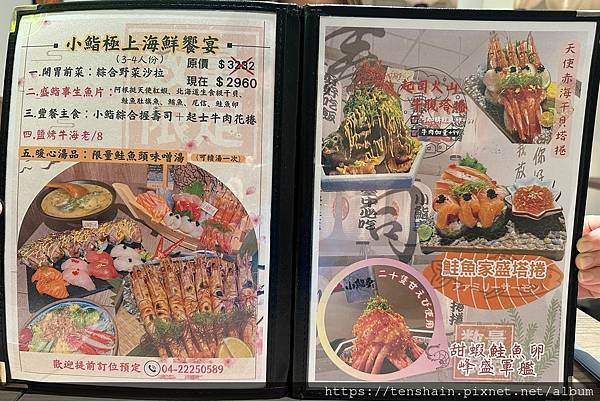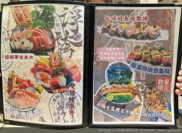 我們難得來台中,當然要好好享受超值美食,看著精美的圖文菜單,不知不覺就點了一大桌,包括七味鮭魚哈那捲和鰻玉四次方壽司兩個主餐,再分別加 99 元升級 B 套餐。此外,加點了一份盛鮨事生魚片和焗烤天使紅蝦。這一餐,無論是視覺、味覺還是嗅覺,都將是頂級的享受!