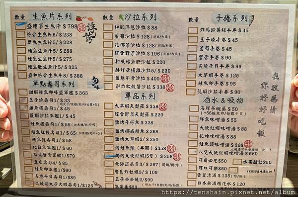 菜單有正反兩面,分成"捲捲捲、生食、熟食、生魚片、單點壽司、沙拉、單品、手捲"等八大系列,以及酒水和吸物。