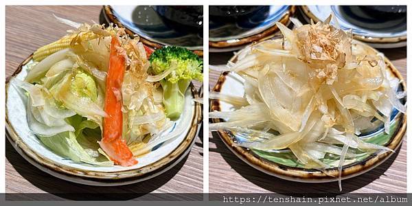 生菜沙拉的內容豐富,包括美生菜、洋蔥、玉米筍、蟹味棒,淋上酸甜開胃的和風醬,最後再點綴一撮柴魚片,讓風味更有層次。新鮮爽脆的生菜,搭配微酸微甜的醬汁,每一口都清爽無比,是完美的開胃前菜。洋蔥沙拉則相對簡單,帶點嗆辣感的特性,能有效清除口中殘留的味道,讓味蕾重置,以便迎接下一道美食,不管是單吃還是搭配其他料理都適合。