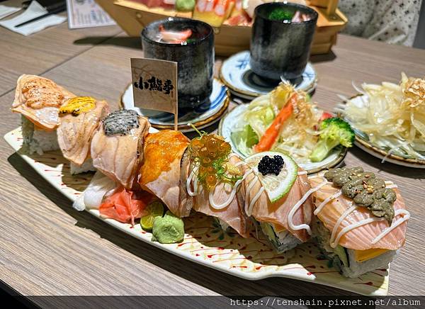 「小鰭事 日式料理」菜色很多,所以不是大人限定,闔家一起來大啖美食也很適合,若是有小朋友隨行,那這款焦糖鮭魚可以試試。把法式焦糖布蕾的概念運用到壽司上,炙燒鮭魚本身的油脂豐厚,搭配薄脆的焦糖,一入口先是脆甜的焦糖風味,融化後與鮭魚的鹹香交融,鹹甜的組合很有層次,連不敢吃生魚片的朋友也會愛上。
