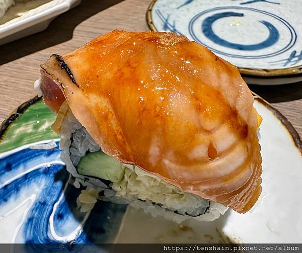 松露的香氣並非人人愛,但是不喜歡起士的人應該不多,尤其是經過炙燒之後的香氣,更是凡人無法擋。不要忘記鮭魚和下面的壽司之間,還藏著一片起士,上下夾攻之下,香氣之濃可想而知。炙燒過的起士和鮭魚口感超速配,鮮嫩的鮭魚加上香濃的融化起士,濃郁的奶香和海鮮的鮮甜融合在一起,大口咬下,鹹、甜、香、鮮,一次滿足,根本是起士控的天堂啊!