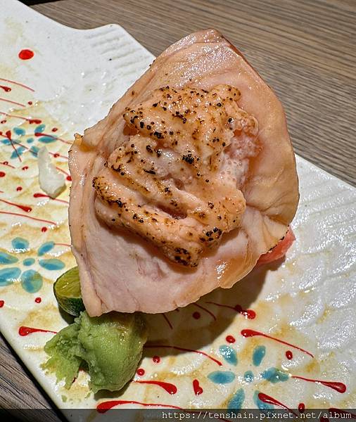 炙燒明太子鮭魚那層厚厚的明太子醬,經過炙燒後焦香撲鼻,鹹香濃郁,每一口都伴隨明太子在口中「嗶嗶啵啵」的微妙顆粒感,搭配上油脂豐富、軟嫩鮮甜的炙燒鮭魚,無疑是雙重享受。