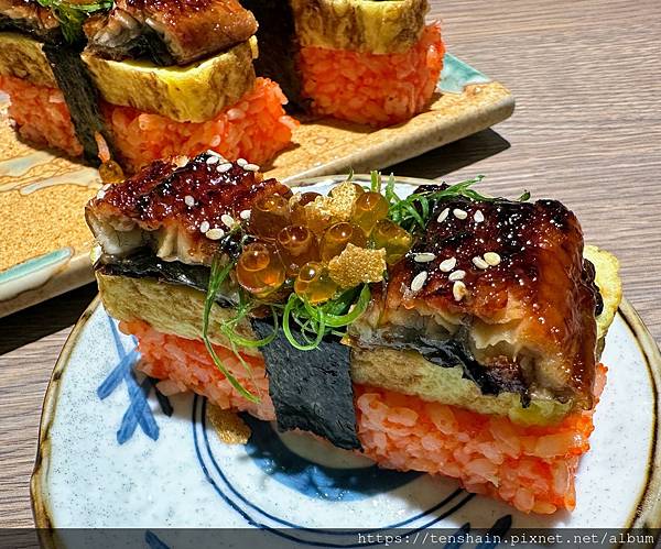 烤得焦香四溢的鰻魚,油脂豐厚,刷上特製蒲燒醬,鹹甜交織,香氣撲鼻。晶瑩剔透的鮭魚卵,咬下瞬間爆出濃郁鮮味,幸福感滿點;金光閃閃的食用金箔,直接讓鰻魚壽司升級成頂級奢華料理。厚厚的玉子燒,口感柔嫩微甜,完美平衡蒲燒醬的鹹香,讓味道更有層次。醋飯裡塞滿的蝦卵,Q 彈的顆粒感,每一次咀嚼都炸出極致的海味享受。如果說鮭魚卵是光彩奪目的大煙花,蝦卵就是以量取勝的小煙火,此起彼落的在口中綻放。這款由鰻魚、玉子燒、鮭魚卵、蝦卵、金箔、醋飯並同演出的壽司,絕對是令人難忘的味覺饗宴!