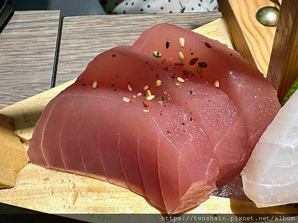 鮪魚刺身是生魚片的經典,脂肪含量較少,肉質綿密細緻,觸感柔軟,完全沒有難咬的筋膜,輕輕一咬,就能感受到魚肉的纖維細緻,清爽甘甜的海洋風味,令人回味無窮!