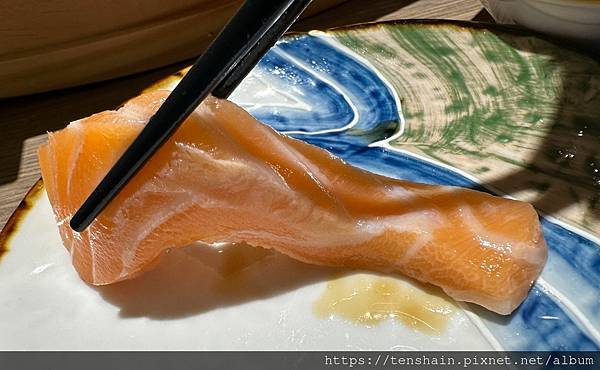 鮭魚肚是鮭魚最好吃的部位,因為油脂含量極高,擁有「入口即化」的夢幻口感。放入口中還沒來得及咀嚼,魚肉就已經開始融化,濃郁的甜味立刻在口中擴散,帶來極致的滑順感。