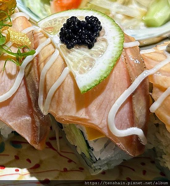 Hana捲(はな巻き,Hana Maki)中的「Hana(はな)」在日文中意為「花」,Hana捲就是捲成類似花朵造型的壽司,也就是我們較常聽到的「花壽司」。這款「七味鮭魚哈那捲」是花壽司的豪華版,從花壽司的基底升級,先鋪上一大片新鮮鮭魚,輕微炙燒後,再加上七種奢華配料:明太子、起士、松露、焦糖、鮭魚卵、檸檬魚子、蟹膏,每一口都有不同層次的風味,絕對會讓你驚艷不已。這道 Hana 捲不只美味,而且色彩繽紛,是一道味覺和視覺的雙重饗宴,非點不可!