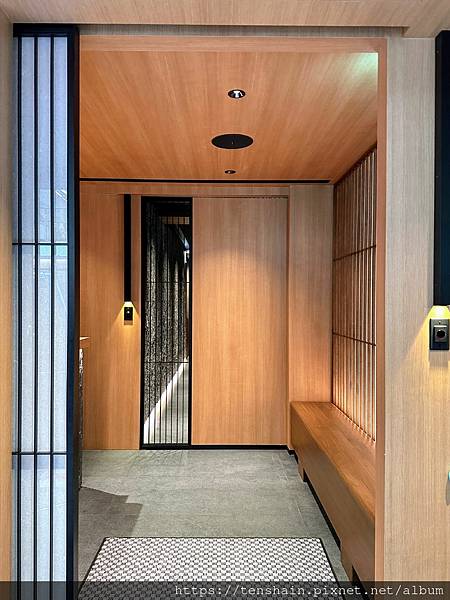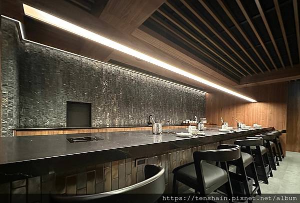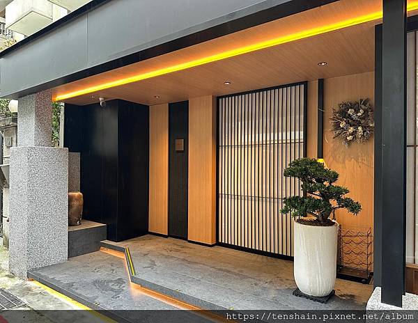 餐廳門面以淺色檜木搭配黑色金屬格柵自動門,營造出簡約中見細節的極簡美學。小巧優雅的暗金招牌,鑲嵌於質感獨具的燒杉木板上,低調卻不失尊貴,完美呼應當代高級餐廳所推崇的神秘氣質與隱密氛圍。