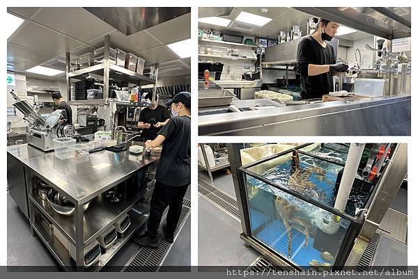 全不鏽鋼打造的廚房空間,從檯面到地板皆保持潔淨乾爽,處處展現專業水準。工作人員統一穿著整潔制服,並嚴格區分肉類與海鮮的處理區域,生熟食也由不同人員分工操作,對食材衛生的講究,完全不亞於米其林級餐廳的高規格標準。