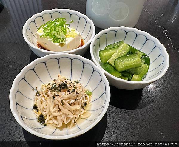 第三道是香甜滑嫩的豆腐,底部襯以主廚熬製的日式鰹魚醬油,上方淋上橄欖油,點綴柚子胡椒與青蔥。食用時建議先拌開柚子胡椒,讓豆香與鹹香、辛香三種風味融合,展現出層次豐富的辛口魅力。