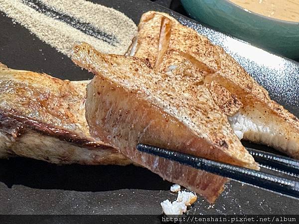 甘青肉質細緻軟嫩,尤以下巴部位最為精華,富含膠質、油脂豐潤。經主廚細心調味後燒烤,膠質完美鎖在魚皮與肉間,鹹香柔嫩、入口即化,讓人一試成主顧。若偏好風味更濃厚,不妨搭配隨附的胡椒鹽,為魚肉增添層次感與香氣,口感更上一層樓。