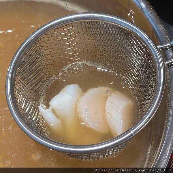 干貝經過短時間燙煮後,外層微熟、內部仍保有水潤鮮嫩,入口即化,充滿天然的甜味;獅魚肉質細緻滑嫩,過熟會失去那種入口化開的口感,而七分熟恰好讓它在保持緊實彈性的同時,又能展現出魚肉的鮮美;花枝則是呈現最完美的 Q 彈狀態,剛剛好的彈牙、不韌不硬,吃起來清爽又帶點自然的甜。