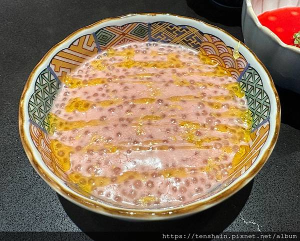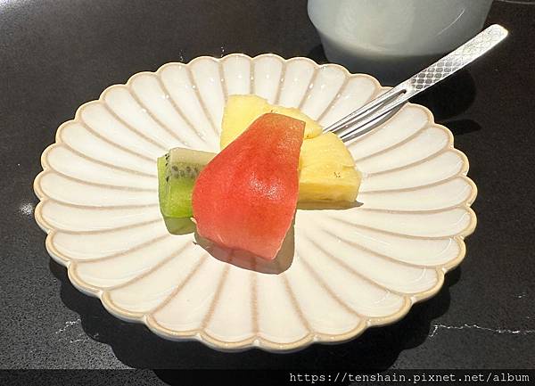 享用完溫潤美味的雜炊後,在等待甜點的片刻,服務人員貼心送上招待的小果盤。裡頭精選台灣當季盛產的水果,鮮嫩多汁、風味十足,搭配精緻擺盤與繽紛色彩,瞬間提升整體質感。