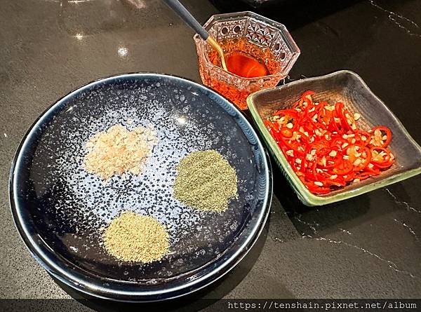 除了招牌蘸醬,SHABU ZEN 的主廚特調辣油同樣值得一試。這款辣油以乾辣椒、黑胡椒、粉紅胡椒與四川花椒四種椒類調製,層層堆疊出細膩而多變的香辣風味。其中八角的甘甜香氣尤為突出,辣度溫和不刺激,卻能有效提味,令人回味無窮。若點了咖哩飯,強烈推薦淋上一點這款辣油,能瞬間拉高整體香氣層次;而熟門熟路的老饕,更會在享用雜炊時加幾滴,讓原本清爽的粥品多了絲絲辛香。至於喜愛牛肉料理的饕客,餐廳還會貼心提供煙燻鹽、胡椒鹽與昆布鹽三款風味鹽,適量沾取可以讓同樣的牛肉變化出不同的風味。